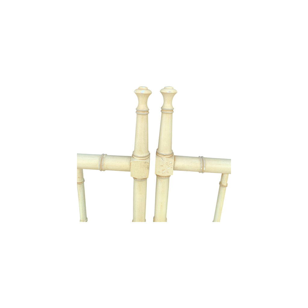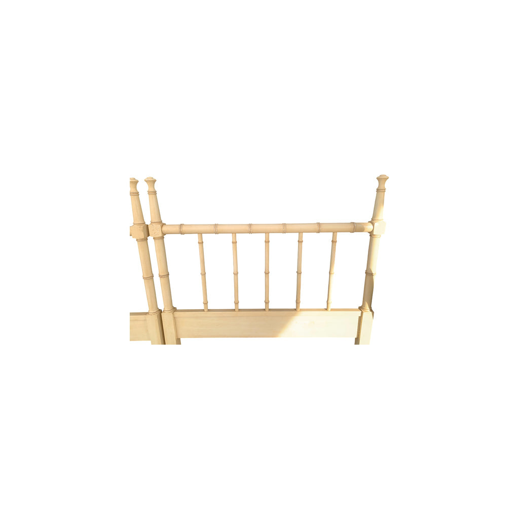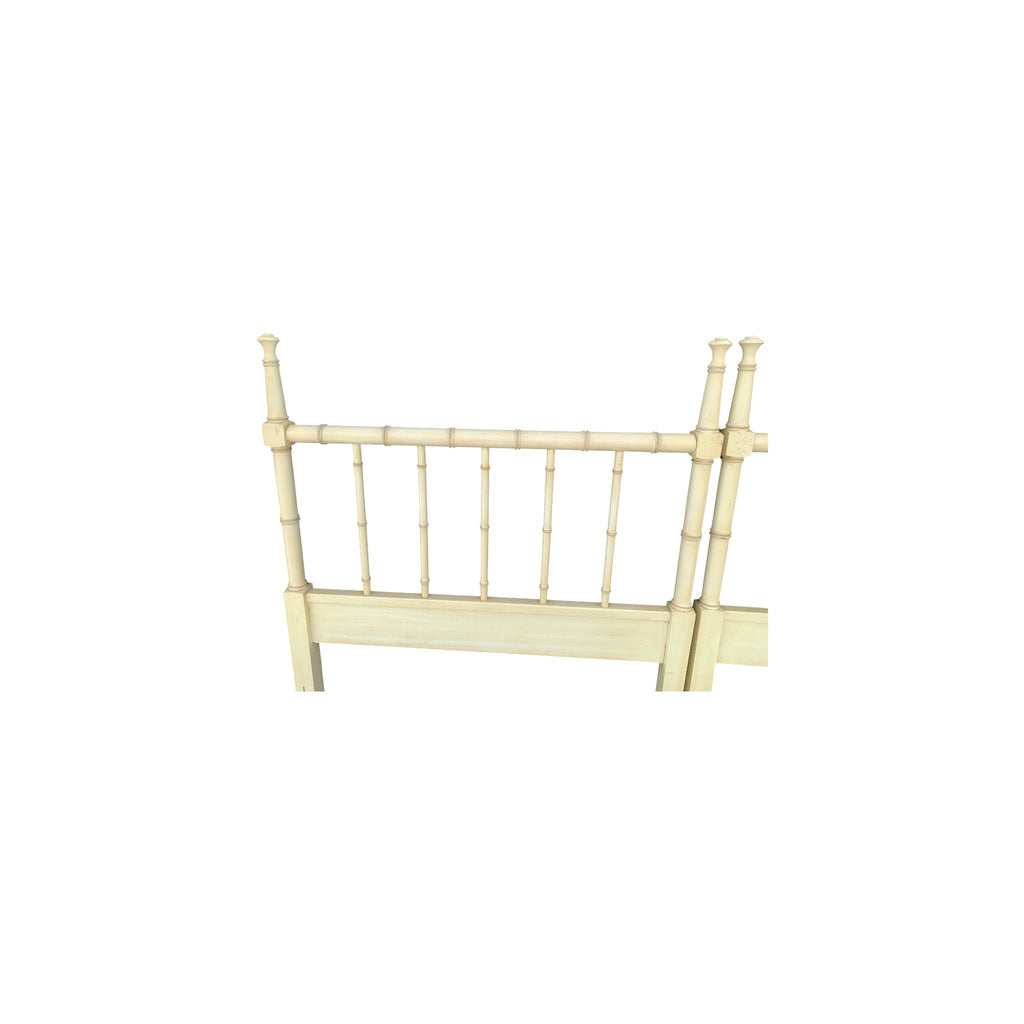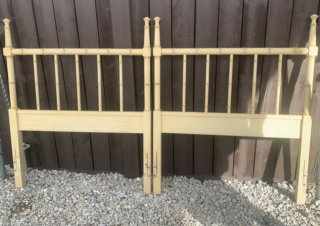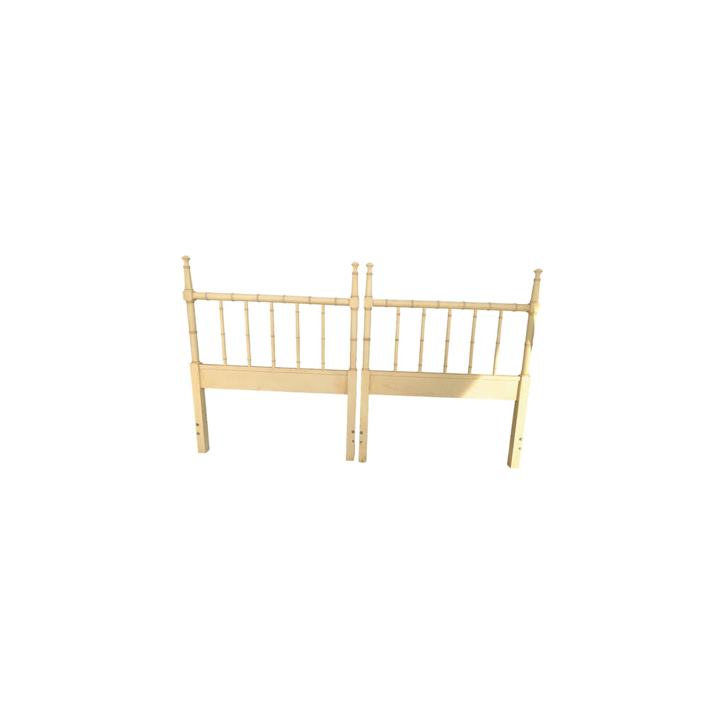 The product is a pair of Twin size Henry Link Faux Bamboo Headboards in the Bali Hai Regency style. These headboards feature a spindle pattern with tall poles and an ivory finish, adding a touch of Hollywood Regency style to any bedroom. Made of faux bamboo material, they are compatible with brands like Drexel, Thomasville, Henredon, and Dixie, and can be mounted to a bed frame. The headboards come from the Bali Hai collection and are designed for a bedroom setting, making them a stylish and elegant addition to any room.
