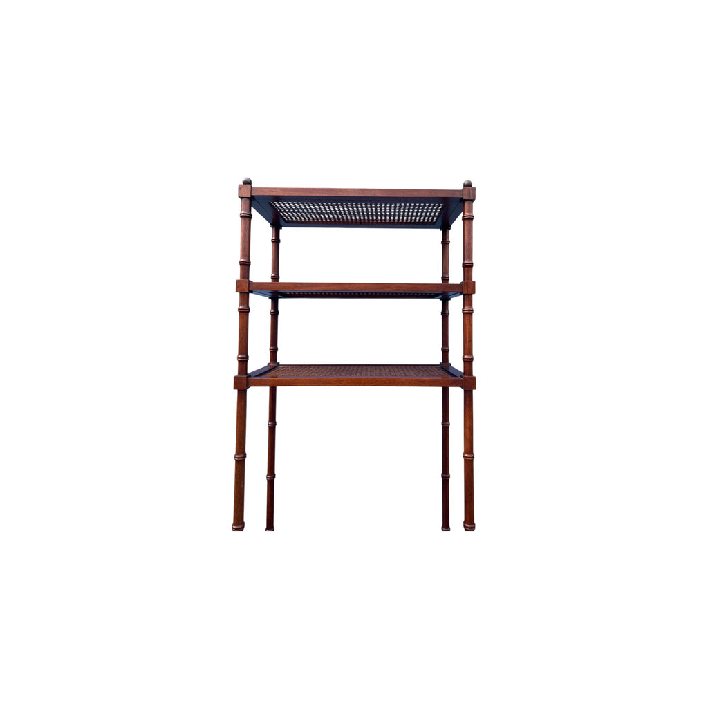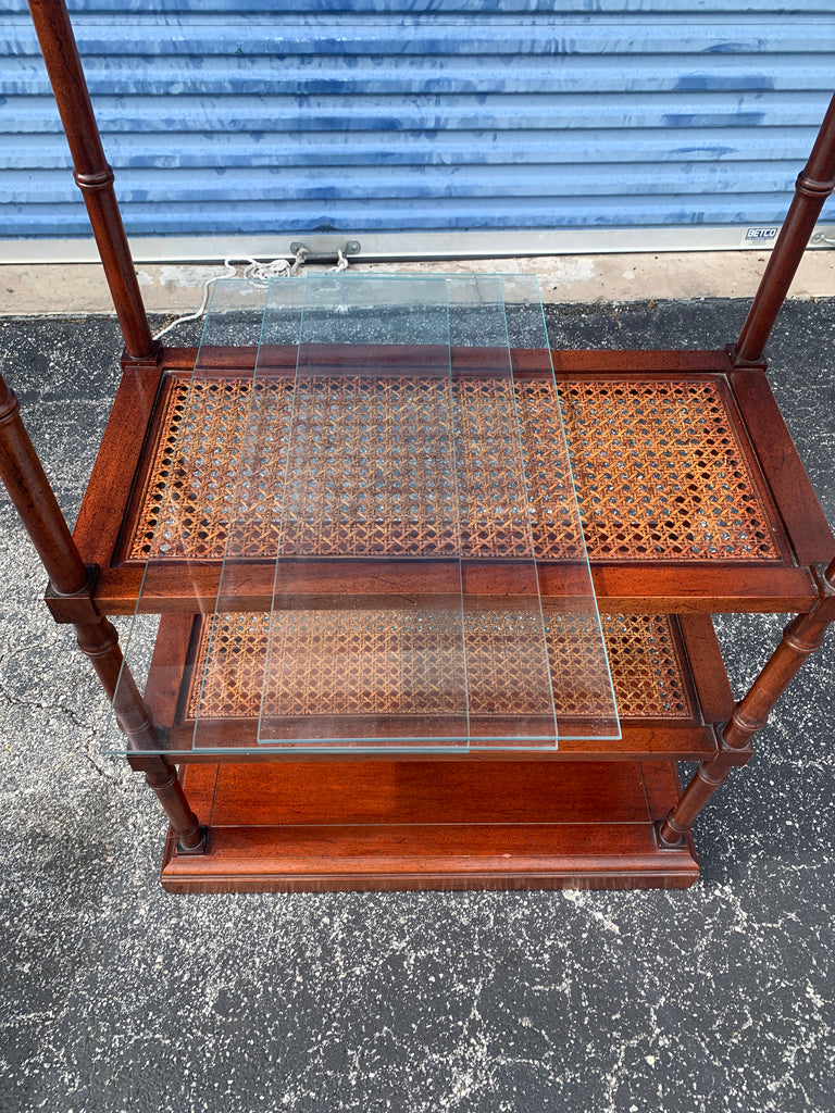 The Hickory Chair Co Cane/Glass Faux Bamboo Etagere is a stylish and unique piece of antique furniture. Standing at 83 inches tall, this original faux bamboo etagere features a brown color and is made of wood. With a width of 30 inches and a depth of 16 inches, this piece offers plenty of storage space while maintaining a timeless and elegant look. Perfect for adding a touch of vintage charm to any room, this etagere is a functional and visually appealing addition to any collection of antique furniture.