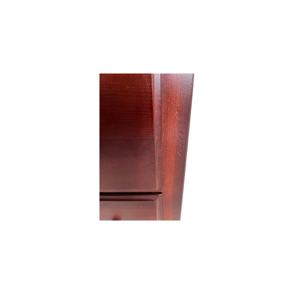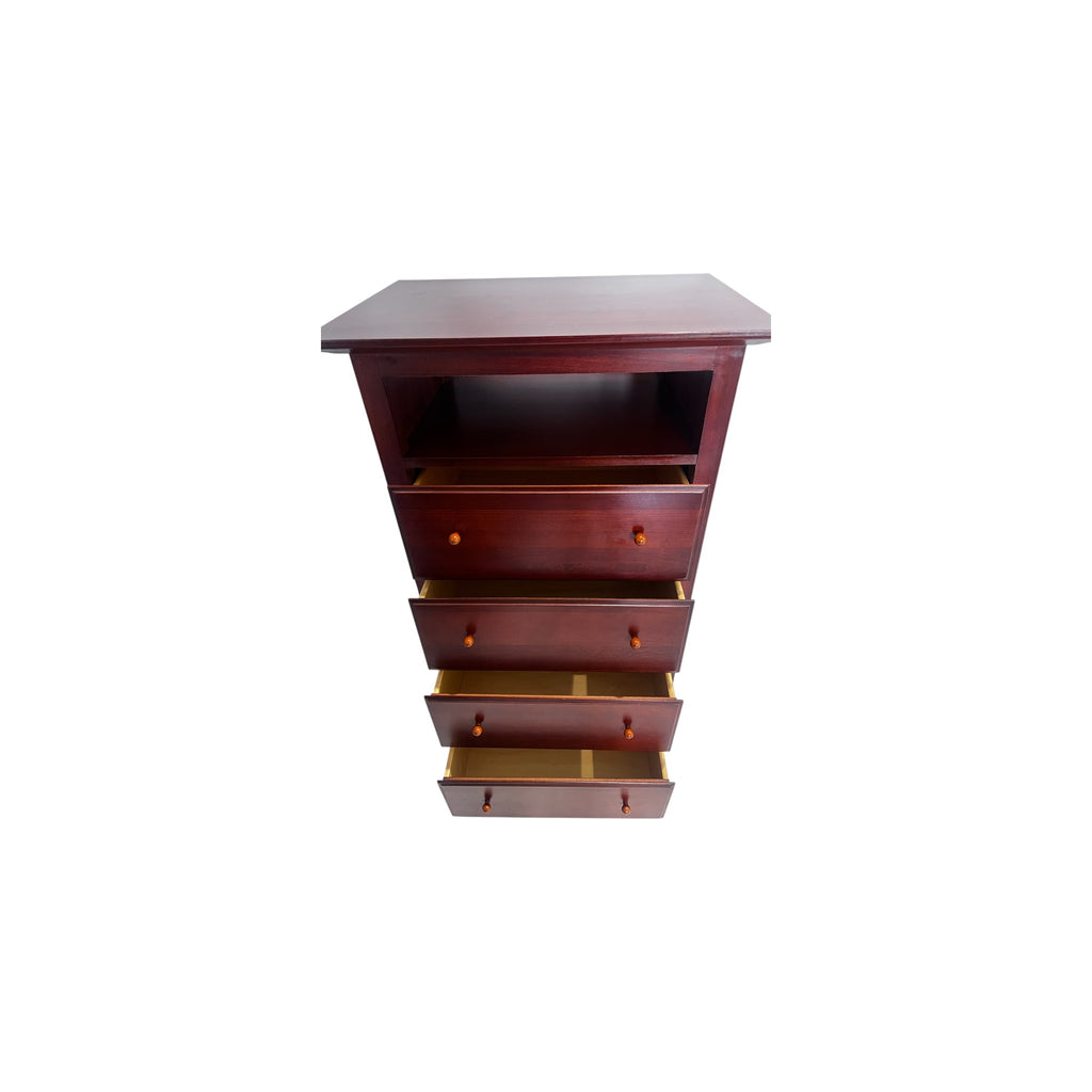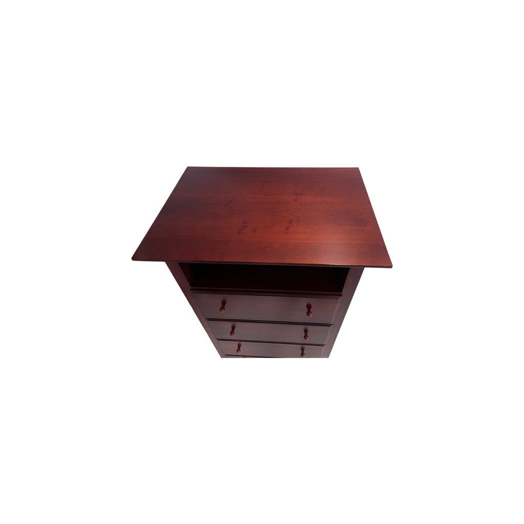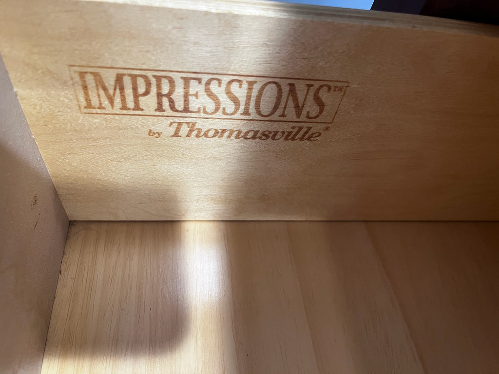 Chest of Drawers by Impressions for Thomasville Bridges Collection. The chest was built with a slightly overhanging top with an open upper compartment that provides a narrow cubby. There are four equal sized drawers with two round wood knobs pulls each. The wood shows natural grain variation and a consistent tone across the case, with sturdy base and side panels that complete the silhouette. This is a discontinued model from the brand.