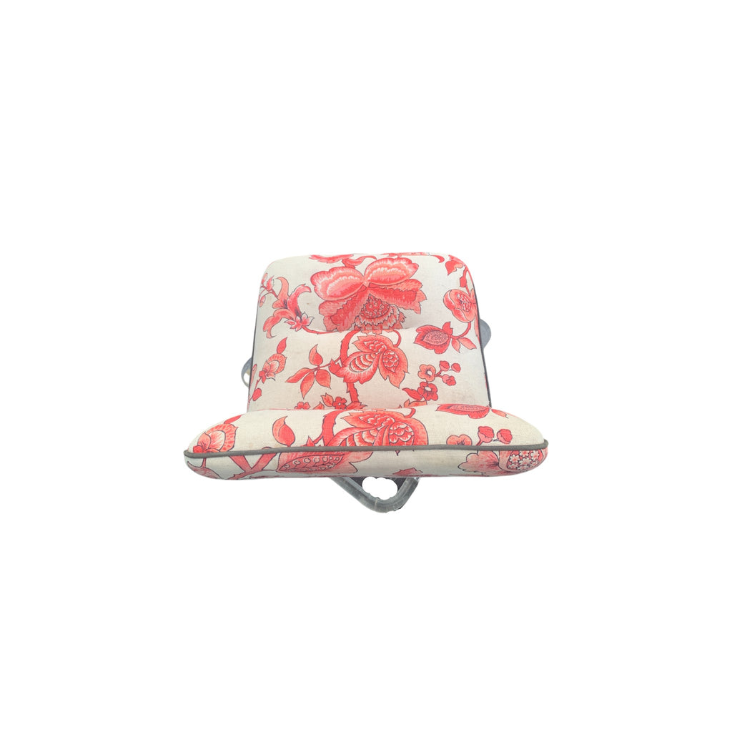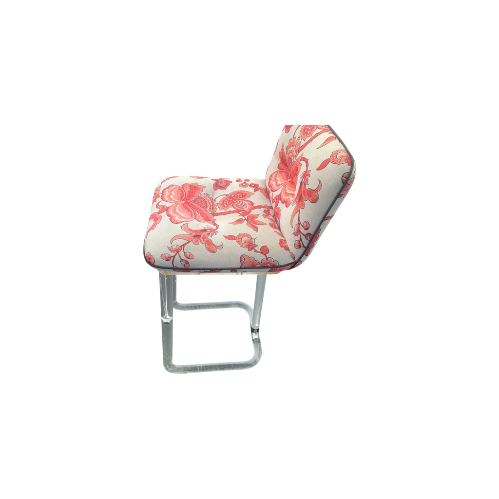 This bar stool features a beautiful, thick Lucite base that curves at the bottom. The chairs swivel and have an upholstered seat.