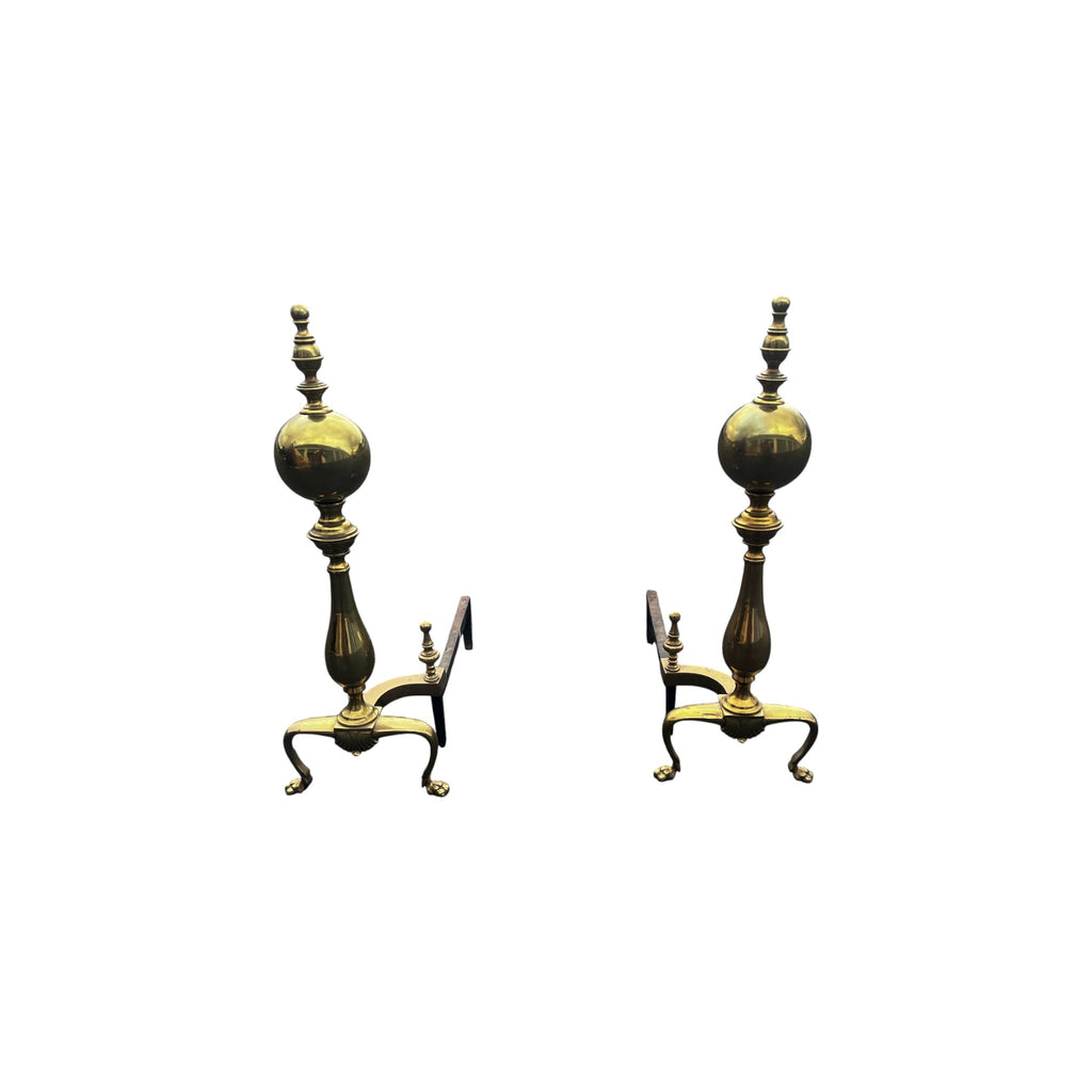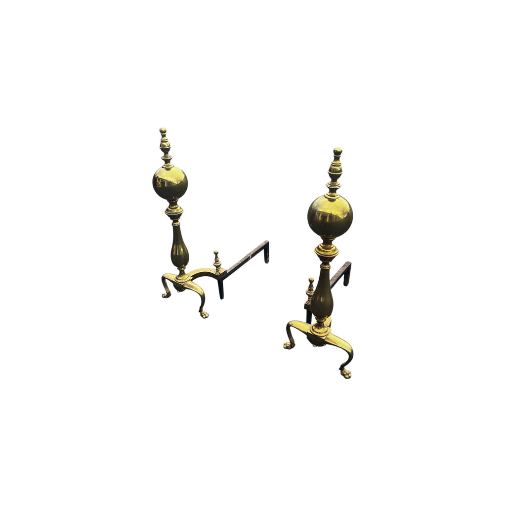 Pair Chippendale Style Cannonball Brass Fireplace Andirons