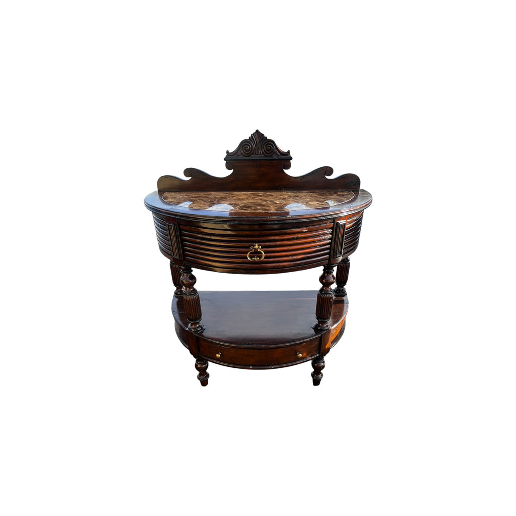 The product is a pair of Marge Carson Demilune Side Tables with marble tops. These antique side tables are fully assembled and feature a unique demilune shape, having marble inlay, a scrolled back crest, both with two tiers and a single top drawer, a bottom tier having a single drawer, both supported on turned feet, single drawer demilune marked to interior , making them perfect for indoor use. With a tabletop material of marble and a brand by Marge Carson, these tables were manufactured during the post-1950 period and feature two drawers for added storage. The dimensions of the tables are 21 inches in length, 42.5 inches in height, and 38 inches in width, making them a stylish and functional addition to any home.
