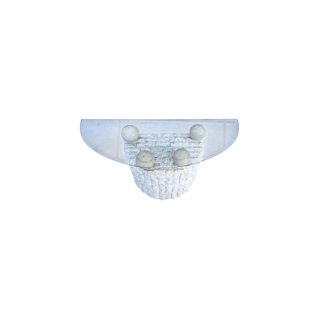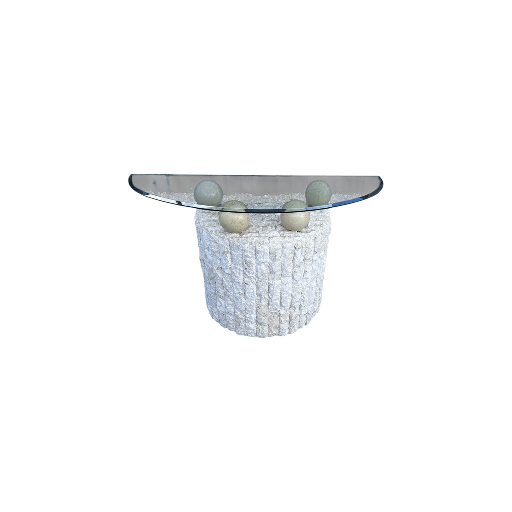 Wonderful vintage postmodern tessellated stone Demi lune console table. Features 4 removable spherical balls which hold up the beveled glass top.