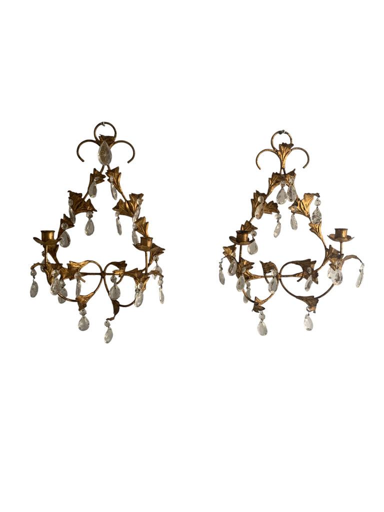 Vintage Florentine Candle Sconce Gold Gilt Leaf crystal teardrops a pair