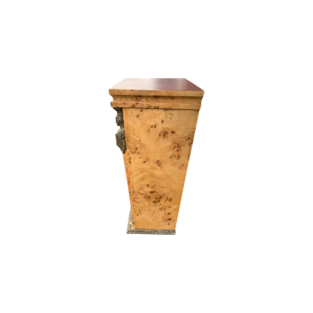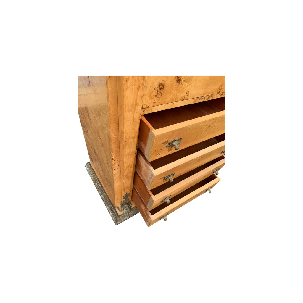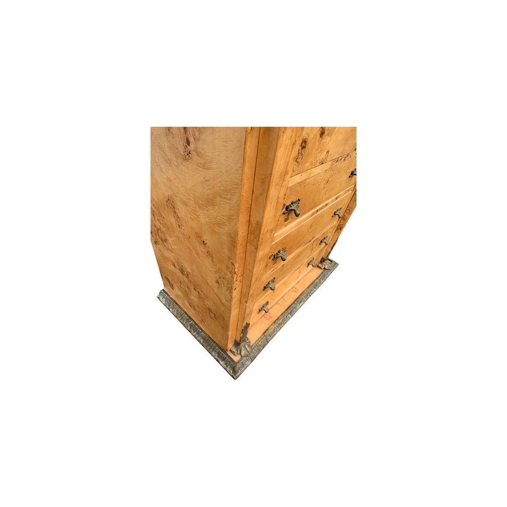 The Vintage French Empire Burlwood Secretaire a Abattant desk with key is a stunning piece of antique furniture from the 19th century. This desk features intricate French Empire styling with a brass handle and a rich brown color. The desk stands at 53.5 inches tall, 20 inches long, and 34.5 inches wide, making it a generous size for a workspace or display piece. Its original design and historical significance make it a valuable addition to any collection of antique desks or secretaries.