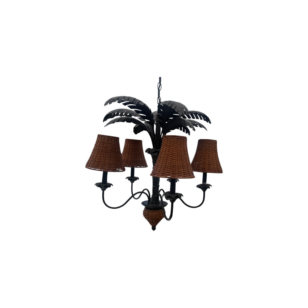 This Vintage Sculptural Palm Tree Chandelier with 5 arms is a unique and stylish lighting fixture that adds an antique touch to any space. Made of wicker and metal, this chandelier features a brown color that complements a variety of decor styles. The vintage original design gives it a timeless appeal, making it a standout piece for those looking to add a touch of vintage charm to their home or garden.
